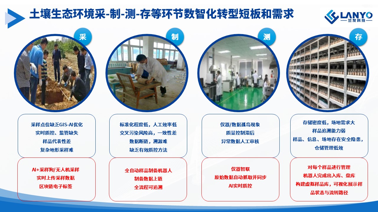 蘭友科技積極響應生態(tài)環(huán)境部數(shù)智化轉(zhuǎn)型的要求,不僅在土壤制樣自動化技術(shù)方面取得了多項創(chuàng)新成果,更是致力于打造土壤生態(tài)環(huán)境監(jiān)測的采-制-測-存-云一體化數(shù)智化解決方案。該方案將加速監(jiān)測行業(yè)的“機器換人”進程,基層用戶需擁抱技術(shù)轉(zhuǎn)型,蘭友科技則將緊跟政策推動產(chǎn)品迭代。最終目標是形成“智能設備-高效監(jiān)測-科學決策”的閉環(huán),提升我國土壤環(huán)境監(jiān)測和管理的精準性和公信力。各方在政策引導下緊密協(xié)作,共同應對數(shù)智化浪潮中的挑戰(zhàn)與機遇。